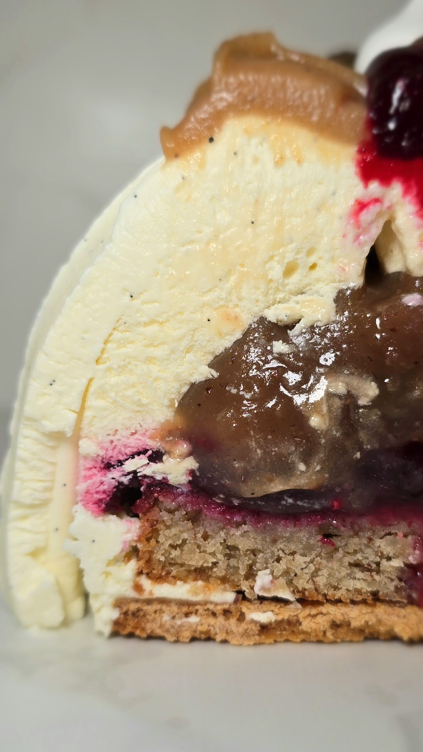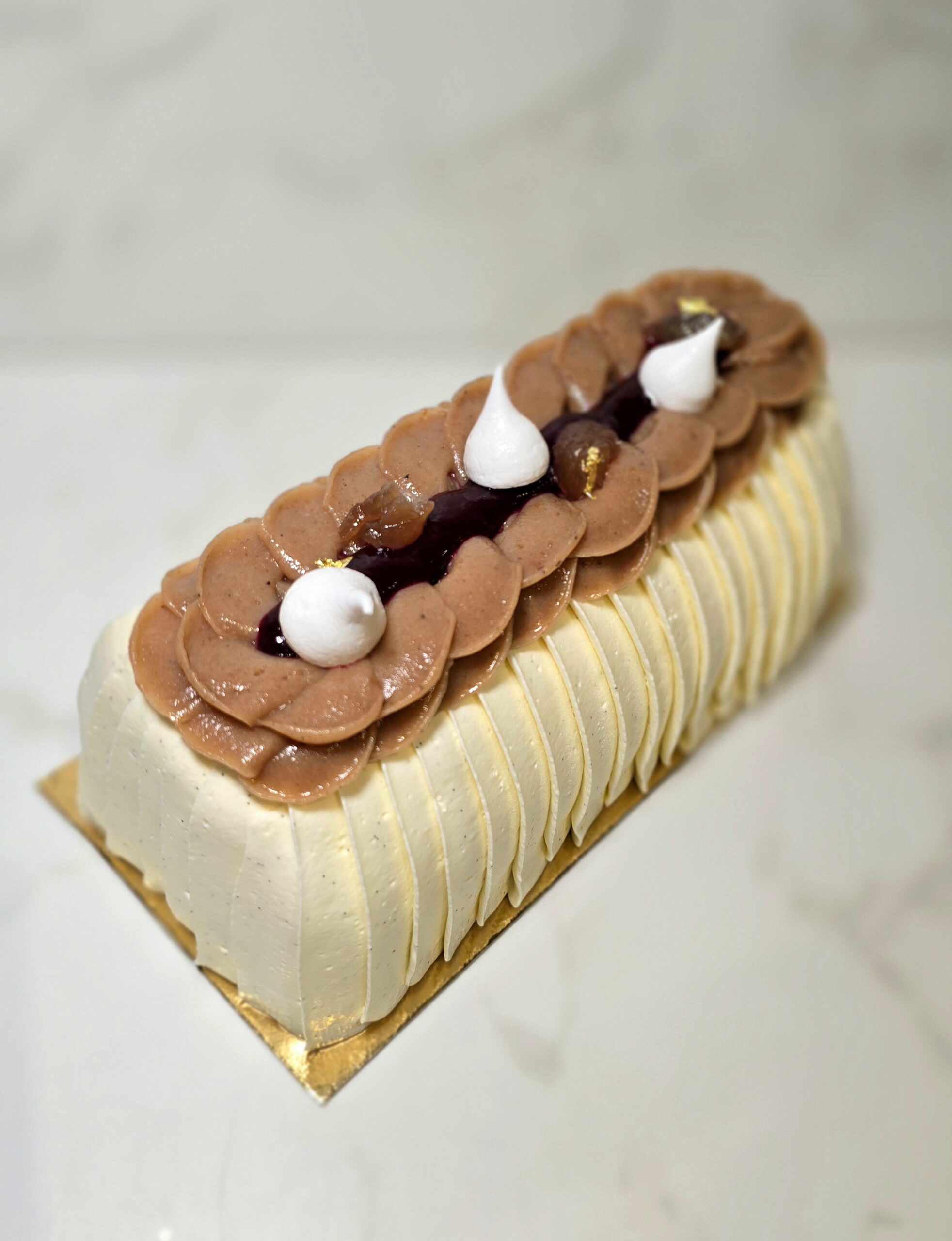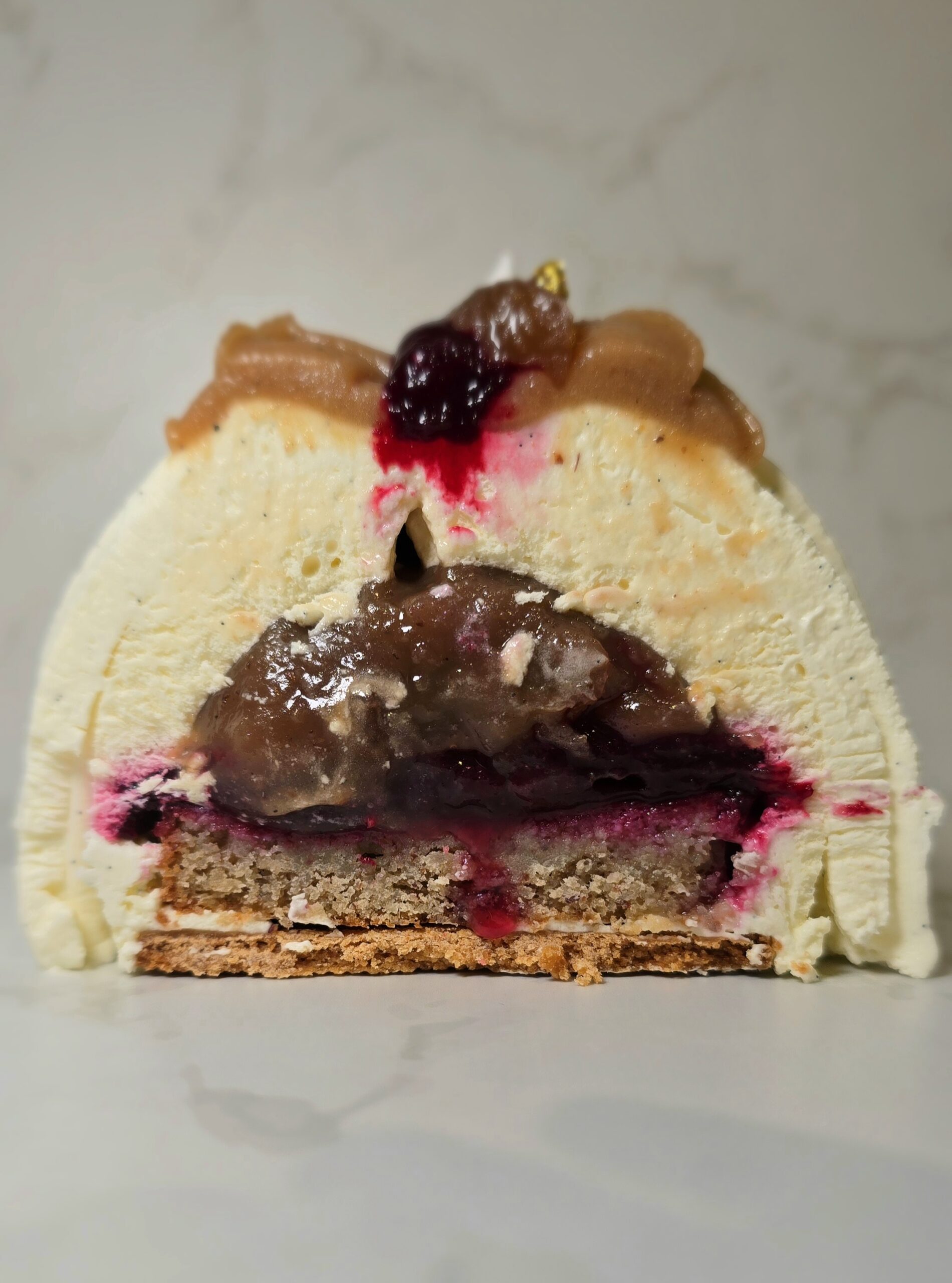 Biscuit moelleux marron, sablé croustillant, compotée cassis, crémeux marron, brisures de marron, mousse vanille, ganache montée vanille, vermicelle marron et meringuettes.