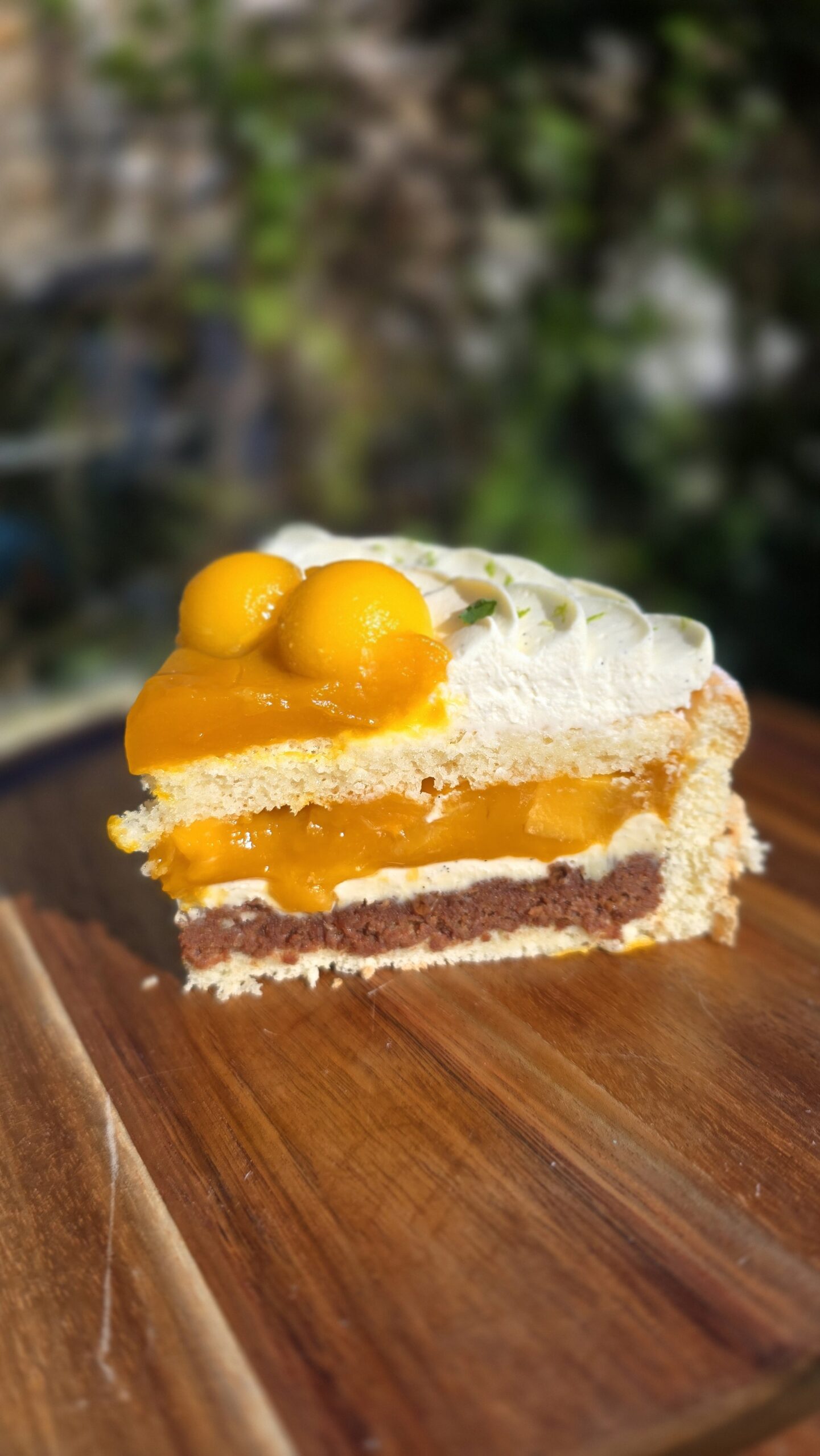 Composition : biscuit cuillère, croustillant praliné, compotée de fruit, crémeux aux fruits, fruits, ganache montée vanille