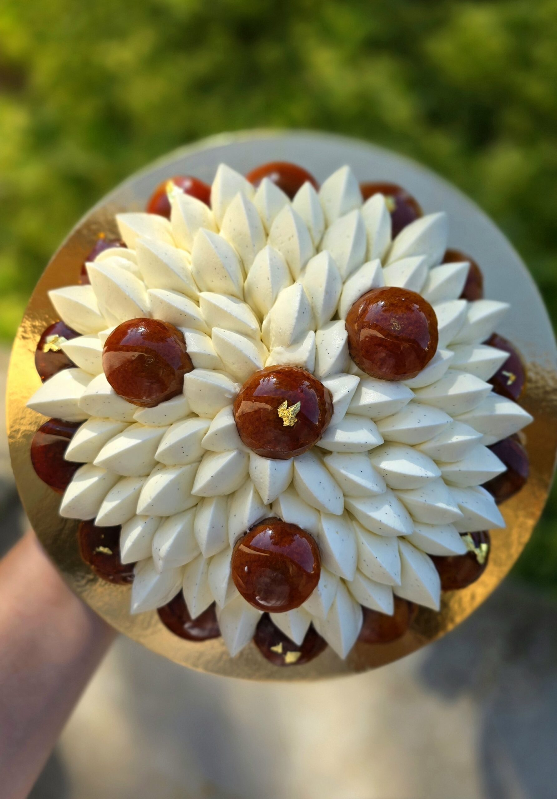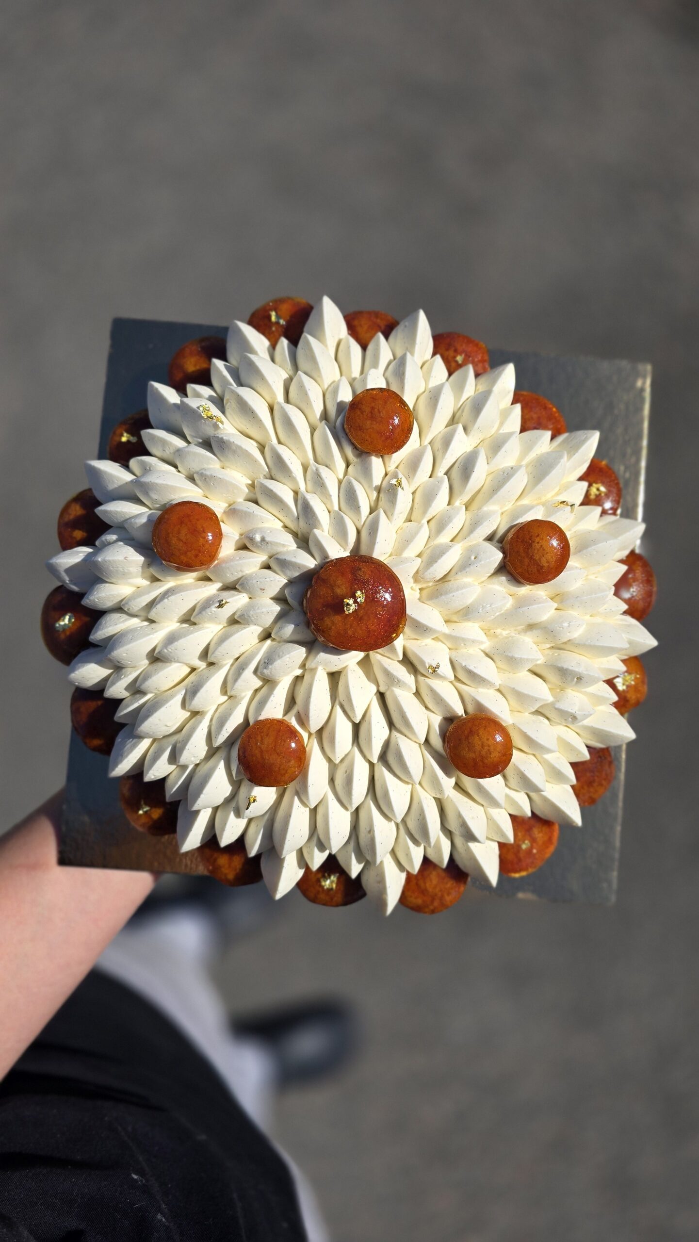 Composition classique : pâte brisée, choux caramélisées, crème diplomate, crémeux vanille, ganache montée vanille