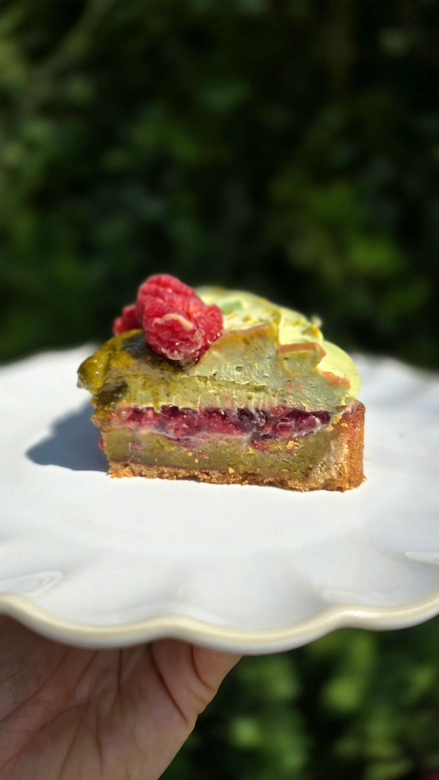 Composition : pâte sucrée, crème d’amande pistache, crémeux pistache, praliné pistache, compotée de framboise, ganache montée pistache, framboises fraîches